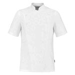 Prestige women's kitchen wear in 100% cotton. This professional kitchen jacket closes with a reversible right/left crossover bib, fitted with hand-made and sewn buttons. For greater comfort during service, “strap” cutouts create a discreet bend and the cuffs are slit. The PLATINE men's kitchen jacket is breathable thanks to the embroidered eyelets under the arms as well as the comfort volume formed by the elbow cutouts. This short-sleeved kitchen jacket also has a blue/white/red braid at the back neckline, a thermo on the front panel and a double compartmented pocket for pens. Available in men's version.